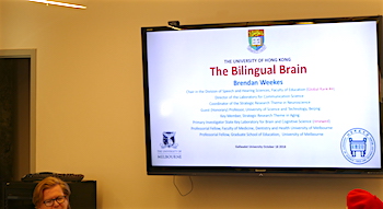 Professor Brendan Weekes (University of Hong Kong) presented his lecture “The Bilingual Brain” on October 18, 4:00 – 5:30 pm at Gallaudet University to a room filled to capacity. Professor Weekes is an internationally recognized expert in the field of the bilingual brain, language and memory processing in individuals who have communication disorders, as well as the application of cognitive neuroscience methods to the diagnosis and treatment of language impairment.